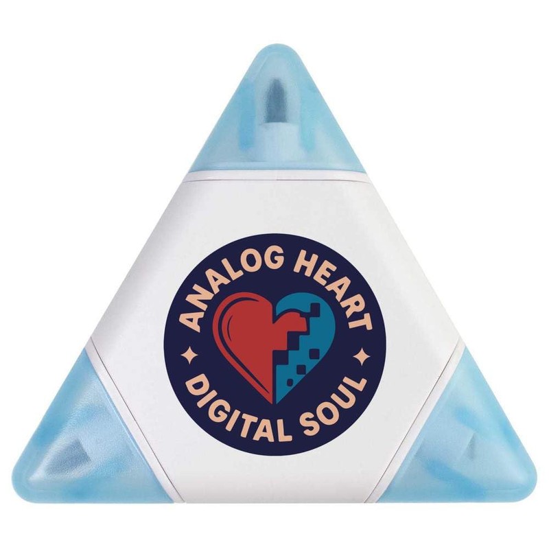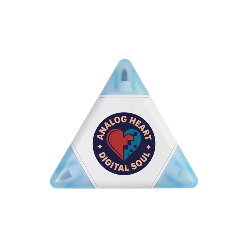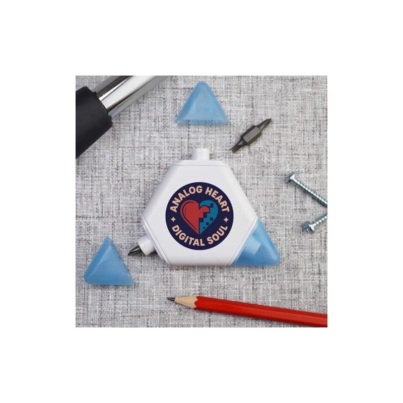 Our triangular compact multi tool is printed on one side with a unique design, making it a great gift for DIY lovers. This 3-in-1 tool set contains a tape measure and 2 different screwdriver attachments and each corner has a snap shut lid. One corner reveals a 1 meter tape measure, while the others hide two reversible screwdriver attachments, one larger and one smaller, both of which have a cross head on one end and a flat head on the other.