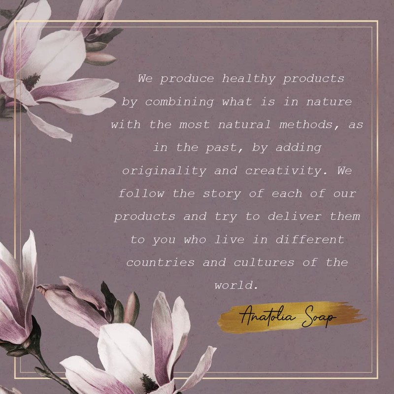 - ✅ ANATOLIA SOAP HAKKINDA : Anatolia Soap markası bölgesel ve sürdürülebilir üretimi desteklemek, yüksek kaliteli, tarihsel değerini koruyan ürünleri piyasada canlı tutmak vizyonuyla kurulmuştur. Doğada olanı en doğal yöntemlerle, eskiden olduğu gibi yine bir araya getirip, özgünlük ve yaratıcılık katarak sağlıklı ürünler üretiyoruz. Her ürünümüzün hikâyesinin peşine düşüp, dünyanın faklı ülkelerinde, kültürlerinde yaşayan sizlere ulaştırmaya gayret ediyoruz.