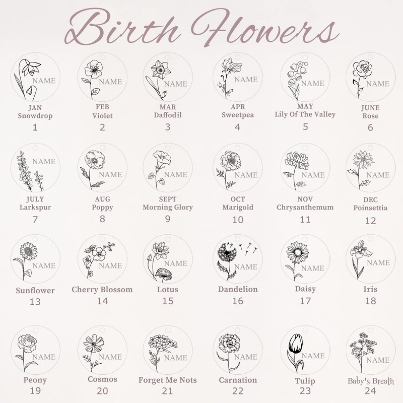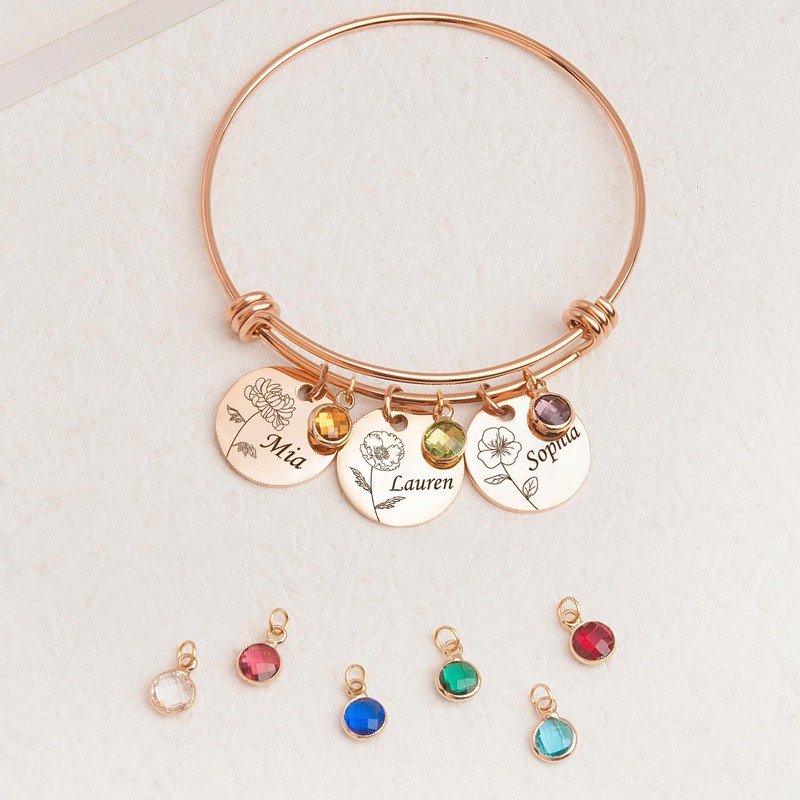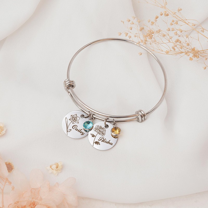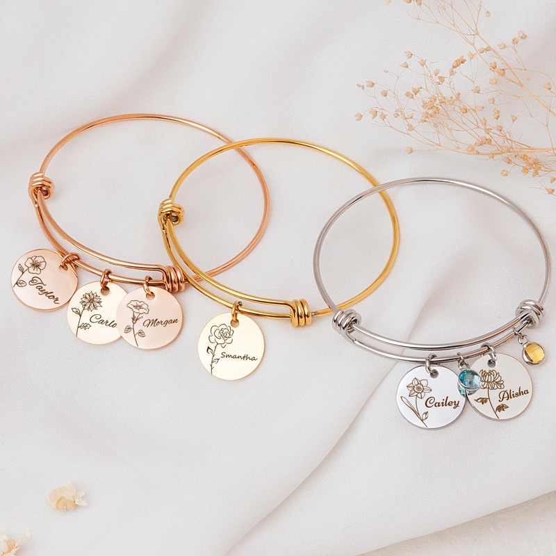- Multi-Disc Birthmonth Flower Name Bangle Bracelet - 12 blooming flowers represent the 12 months of a year. Choose your birthday month flower or your favorite flower with our 24 flower selections. Surprise your loved one with this special and elegant personalized jewelry gift. It's a love connection amount mother and ks, family, friends, and lovers. Each necklace is proudly designed and handmade in the US.