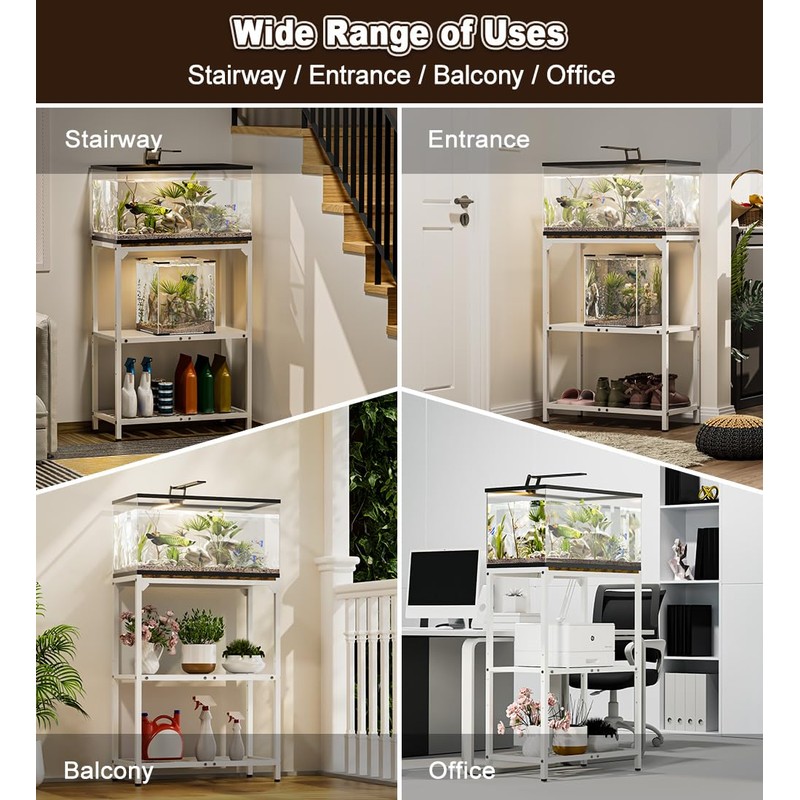 - Space Saving 3-In-1 Design: Our 20 gallon fish tank table stand features a 3 tier design. The top tier accommodates 5-20 gallon aquariums. The middle tier can be used for additional aquariums or other supplies, supporting tanks from 5 to 15 gallons. The bottom tier is ideal for storing fish food, cleaning tools, plants, books, and more. This vertical arrangement maximizes space efficiency, allowing convenient access to your essentials