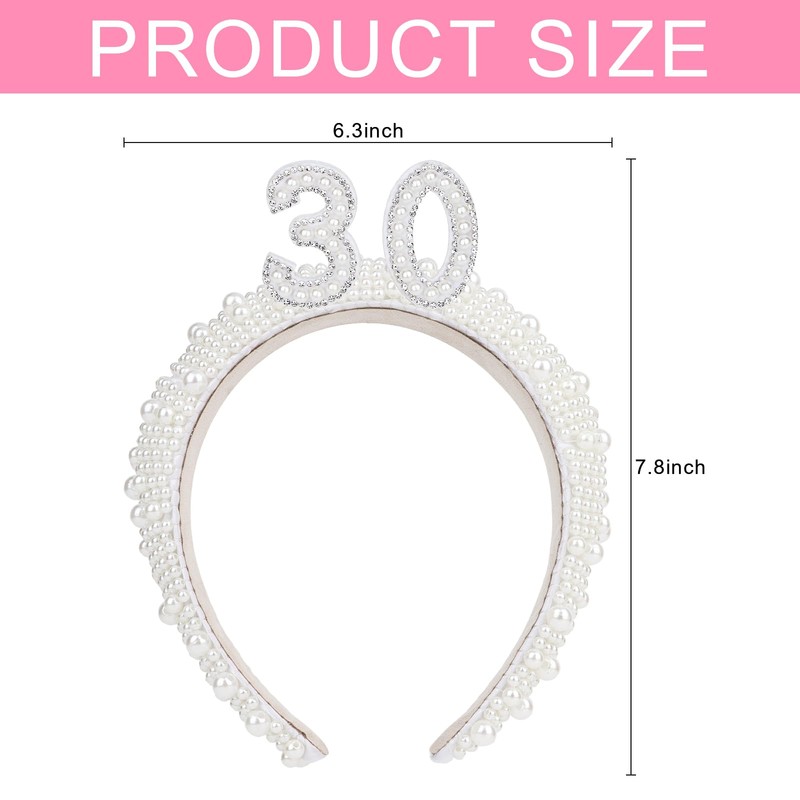 - Suitable Size: Suitable Size: The size of [30] birthday headband party decorations for her is 6.0 x 7.8 inches, made of white pearl and small rhinestones to let you look more attractive. Perfect for 30th party use, makes the most stunning on your special day
