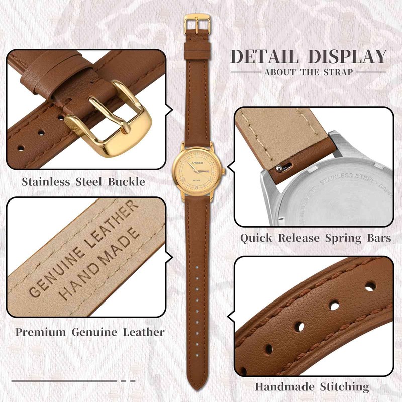 Anbeer 14mm Flat Thin Elegant Genuine Leather Watch Strap,Quick Release Replacement Watch Band,Brown with Gold Buckle