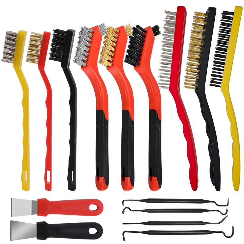 - Wire Brush Set for Cleaning: This 15-piece set includes 3 stainless steel brushes (rust-free), 3 brass wire brushes (scratch-resistant), and 3 nylon brushes (gentle), plus 2 scrapers and 4 nylon double-ended hooks. Ideal for removing rust, paint, limescale, and grease in the kitchen, bathroom, and workshop