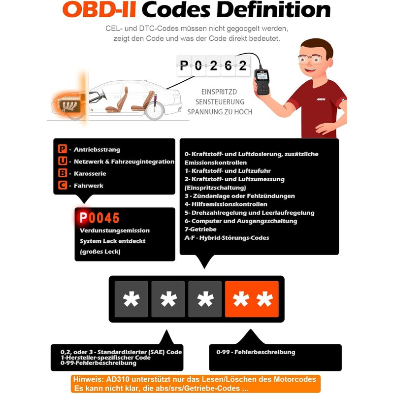 - Accurate quick and easy to use: AD310 car diagnostic tool can help you or your mechanic understand whether your car is in good condition, provides exceptionally accurate and fast results, reads and clears engine error codes in seconds. If you want to find out the cause of the check engine light, car diagnostic device and fix the problem immediately and without any car knowledge. No need for batteries or a charger, get power directly from the OBDII Data Link Connector in your vehicle.