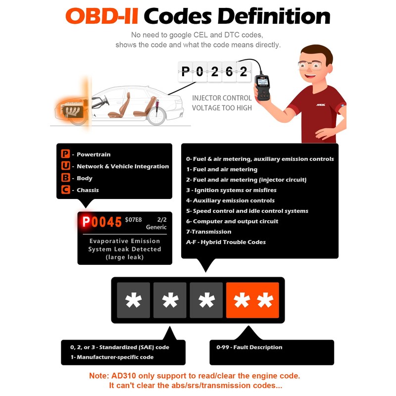 - OBDII Protocols and Car Compatibility: Many cheap scan tools do not really support all OBD2 protocols. This is not the case with the AD310 scanner as it can support all OBDII protocols such as KWP2000, J1850 VPW, ISO9141, J1850 PWM and CAN. This device also has extensive vehicle compatibility with 1996 US-based, 2000 EU-based and Asian cars, light trucks, SUVs, as well as newer OBD2 and CAN vehicles both domestic and foreign. Check compatibility with your vehicle model before purchasing.