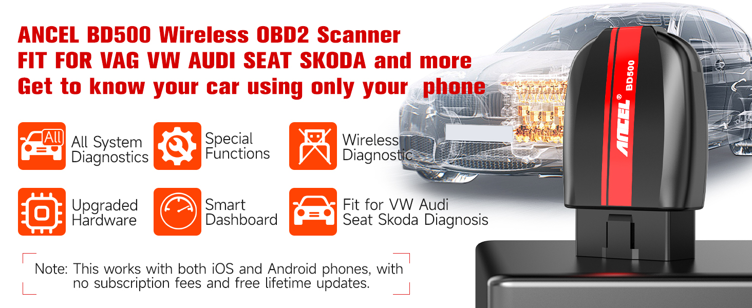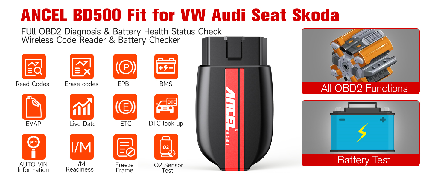 ANCEL BD500 Bluetooth Diagnostic Scan Tool for VW Audi Seat Skoda Diagnosis, Full Systems Volkswagen OBD2 Scanner Vag Car Code Reader with Battery Check EPB Reset for iPhone, iPad & AndroidAbout this item