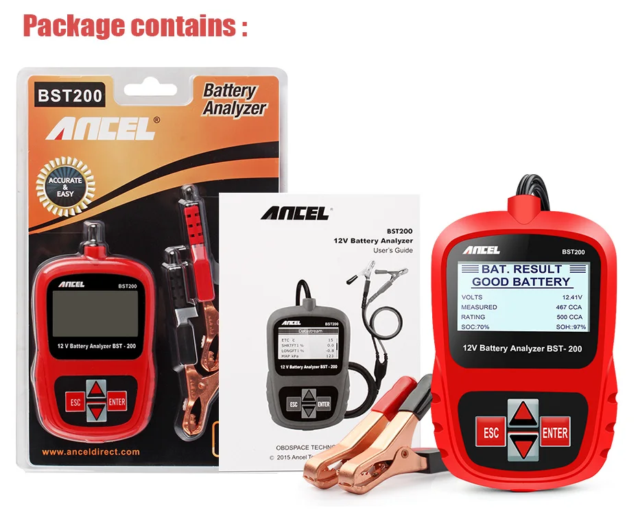 ANCEL BST200 is a12V car battery tester, can gives you the basic battery parameters such as voltage, internal resistance, battery health and charge status. Additionally, BST200 will also show you professional advice whether to replace or charge the battery, it a basic but useful car tool for private car owner.