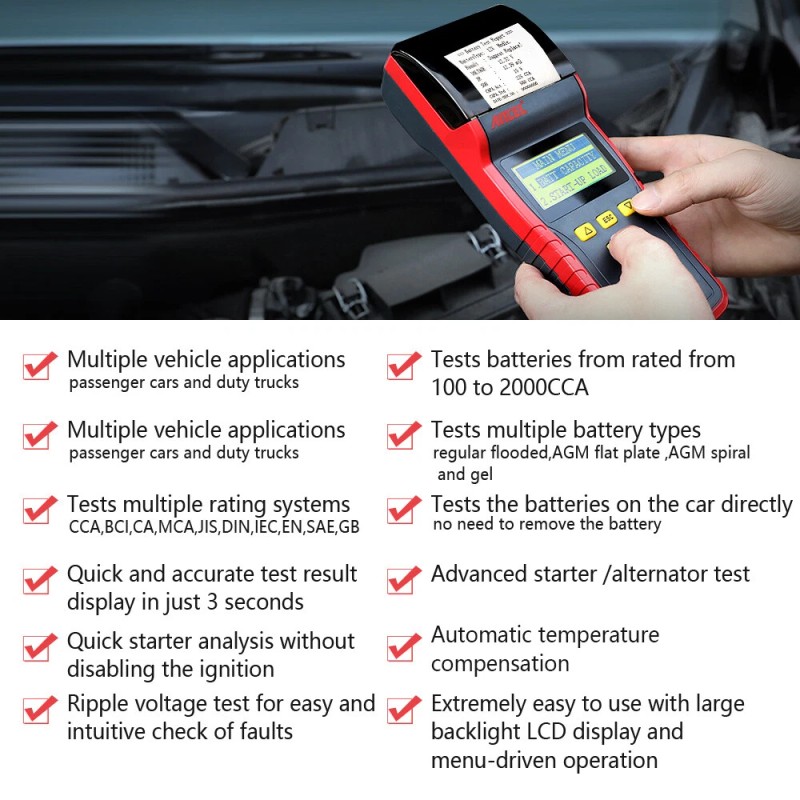 - Features: Bad Cell Detection, LCD Display, Multi-Language Interface, Detects bad cells, Tests batteries from rated from 100 to 2000CCA, Tests multiple rating system-CCA,BCI,CA,MCA,, no need to remove the battery, Tests 12&24 volt charging system, Advanced starter /alternator test