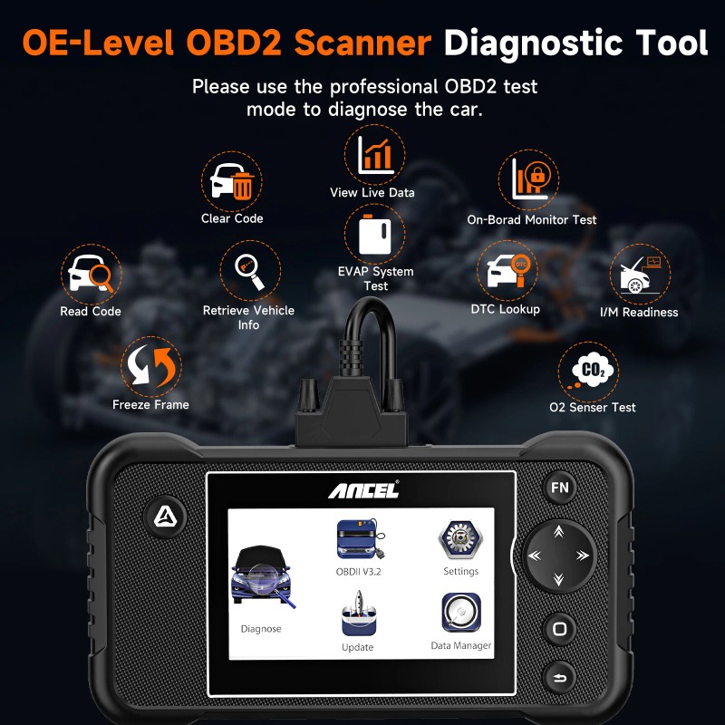 [FULL OBD2 Scanner] ANCEL FX3000 Elite Supports turns off Malfunction Indicator Lamp (MIL), reads/clears fault codes and resets monitor, graphs live data stream, displays freeze frame data, tests O.2 sensor, EVAP System Test, I/M readiness status (e-miss-io-ns), tests advanced on-board monitoring, and retrieves vehicle information (V-I-N).In addition, the product has been upgraded with the latest hard - ware devices of 2024, and the response speed is 3 times faster than other car code reader.