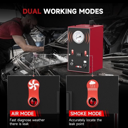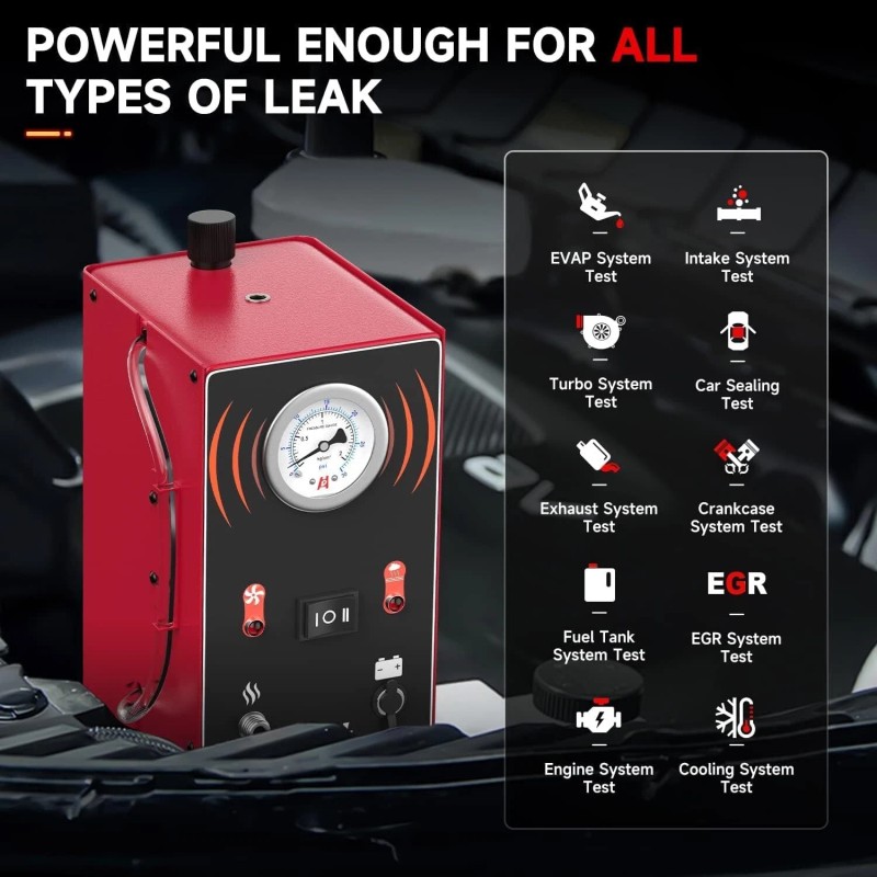 With this automotive smoke machine leak detector, you can detect Crankcase System, Intake System, Exhaust System, Fuel Tank System, EVAP System, Throttle Shafts, Engine Block, Turbo Test System, Cooling System Test, Various Pipe Fittings Test, etc.