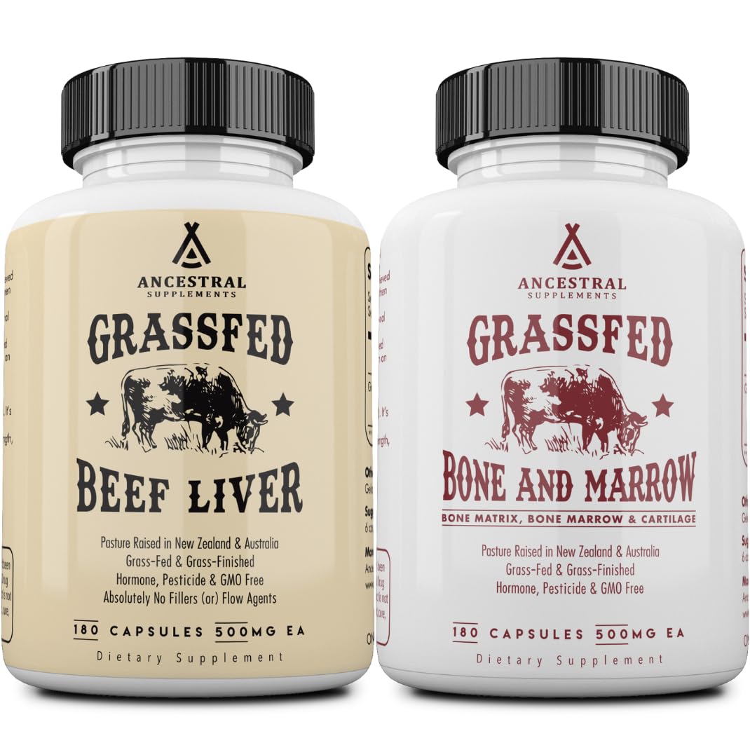 Ancestral Supplements Grass Fed Beef Liver and Grass Fed Beef Bone and Marrow Supplements 180 Capsules, Bundle