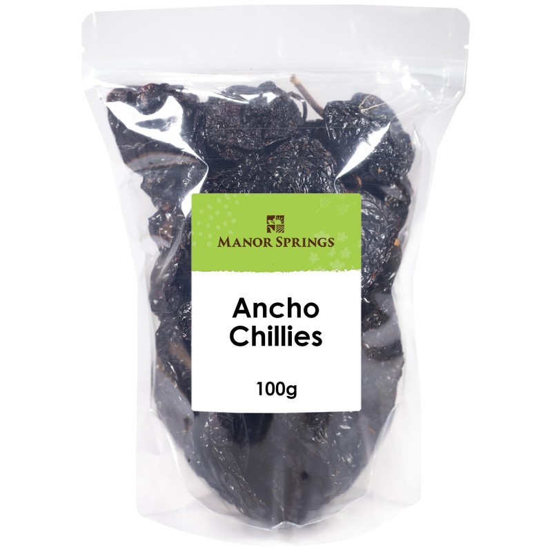 - Manor Springs Ancho chillies are the dried version of the almost ripe poblano chilli. They are harvested before they ripen, but our ancho chillies are allowed to ripen to further develop their flavour, making them sweeter than the unripened peppers.