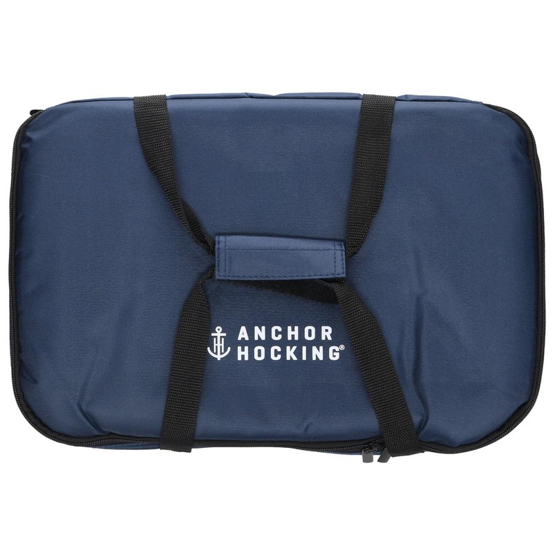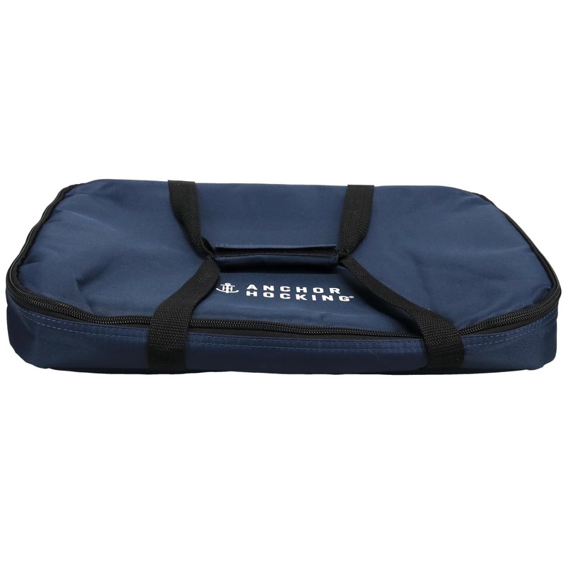 - ''' Set contains: (1) 3-quart Baking Dish with Navy Blue Plastic Lid, (1) Navy Blue Insulated Tote and (1) Hot/Cold Pack#||# Anchor glass bakeware is tempered for maximum durability#||# Anchor glass is a healthier choice over metal bakeware; glass does not Discolor, retain smells, or leach chemicals into food#||# Glass is microwave, pre-heated oven, refrigerator, freezer, and dishwasher safe; lids are BPA free and top rack dishwasher safe#||# Anchor glass bakeware is made in the USA and features an industry-leading 5 year warranty'''