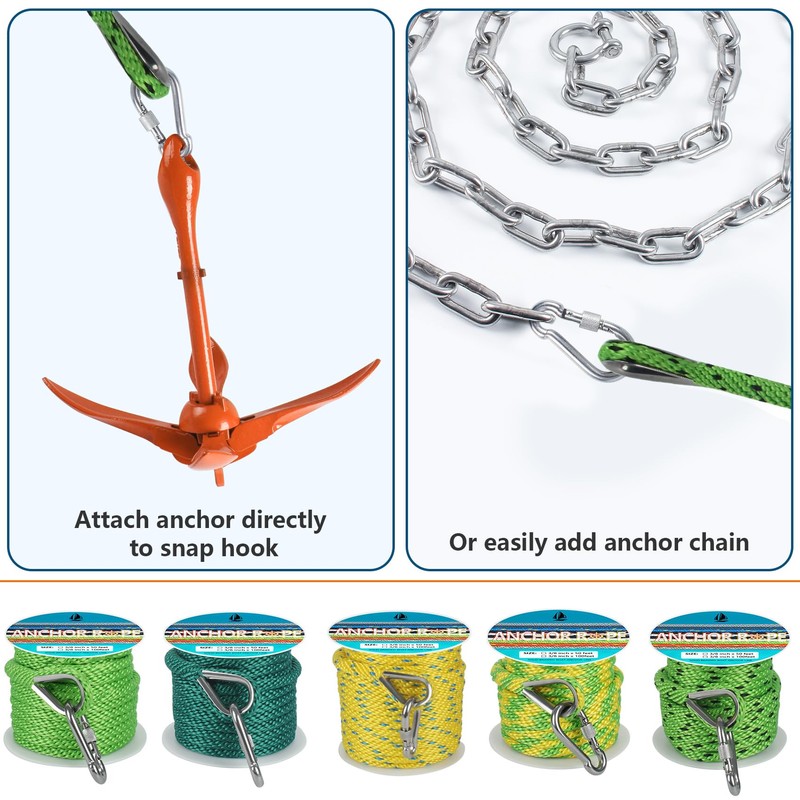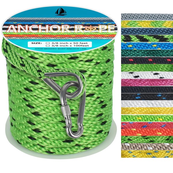 • 【VARIOUS COLORS AND SIZES】: Our anchor rope for boat are available in multipal color and length to meet your needs for anchor line, the size of boat anchor rope is 3/8 inch x 50ft and 3/8 inch x 100ft anchor rope: white & black/black & red/blue & yellow/grey/navy blue/black/white/green & yellow/orange & yellow/gold & white, light yellow/light green, black/light green, black & lake blue, light yellow & lake blue, light green & black, red & lake blue, forest green, light green, light yellow, pink