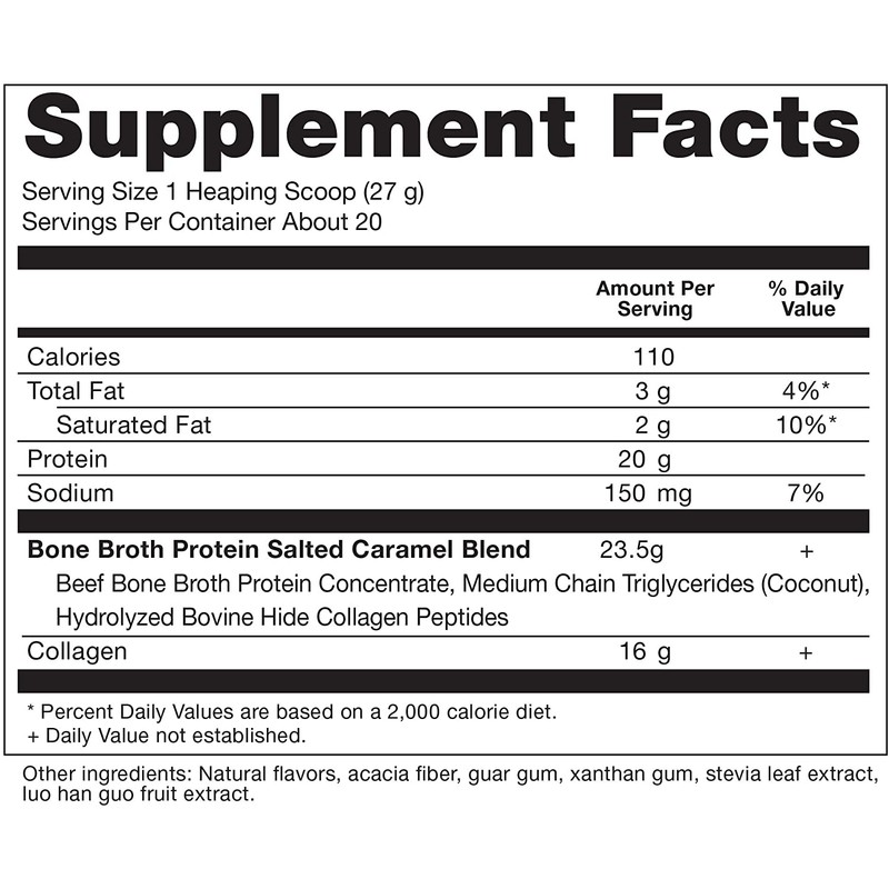 - NEW: Our Bone Broth Protein Salted Caramel features beef collagen from pasture-raised bovine and has no artificial ingredients. A breakthrough protein supplement that delivers the benefits of homemade bone broth is now in a convenient, easy-to-mix and great tasting natural salted caramel flavor!