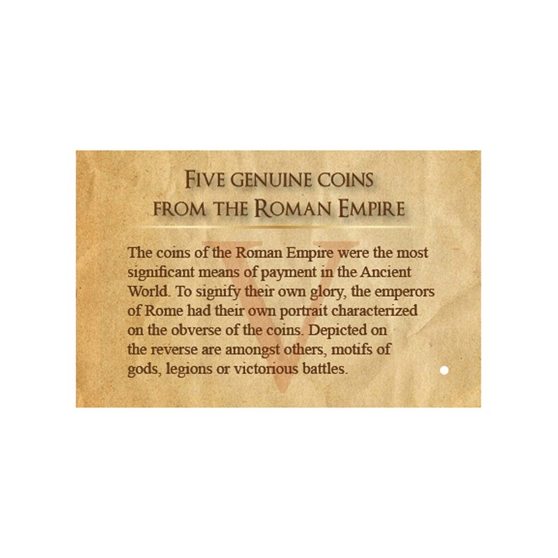 - This historical collection contains five genuine coins from the time of the Roman Empire