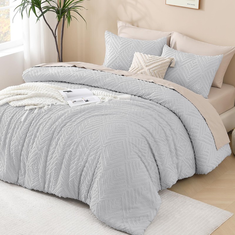 Andency Light Grey Boho Queen Comforter Set, Lightweight Fluffy Bedding Comforter Sets for Queen Bed, 3 Pieces Tufted Farmhouse Shabby Chic Bed Set for All Seasons (1 Comforter 90x90In, 2 Pillowcases)