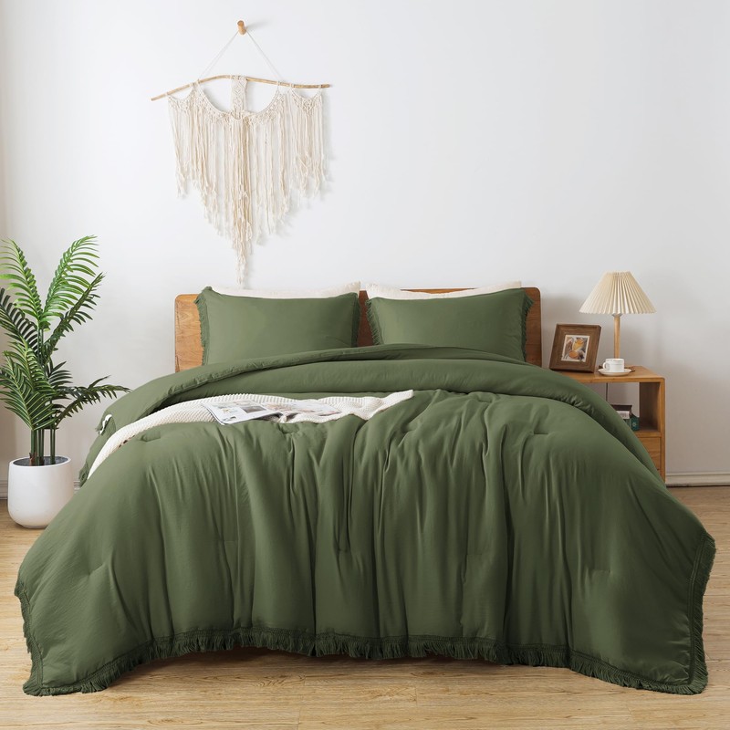 - What You Will Get: 3 Pieces Comforter Set Includes: 1 Comforter and matching 2 Tassel Pillowcases. Please allow a 1-2 inch actual error. Warm Tips: Our boho fringe bedding set is packed in a vacuum bag, there might be some wrinkles when you receive it. You can put it to sunlight and pat it gently, then it will fluff up nicely after hours
