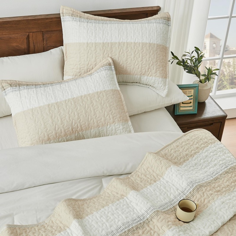 - [Striped Quilt] Andency stripe quilt set is designed in beige and white patchwork stripes, the beige stripes pattern makes the bedspread cover look more elegant and modern. It is never out of date. An beige stripe quilt will also give your bedroom a stylish decoration, and simple lines tend to be neutral and can easily bring a relaxed mood. It will be suitable and upscale for any room in your house, such as a bedroom, guest room, children's room, vacation room