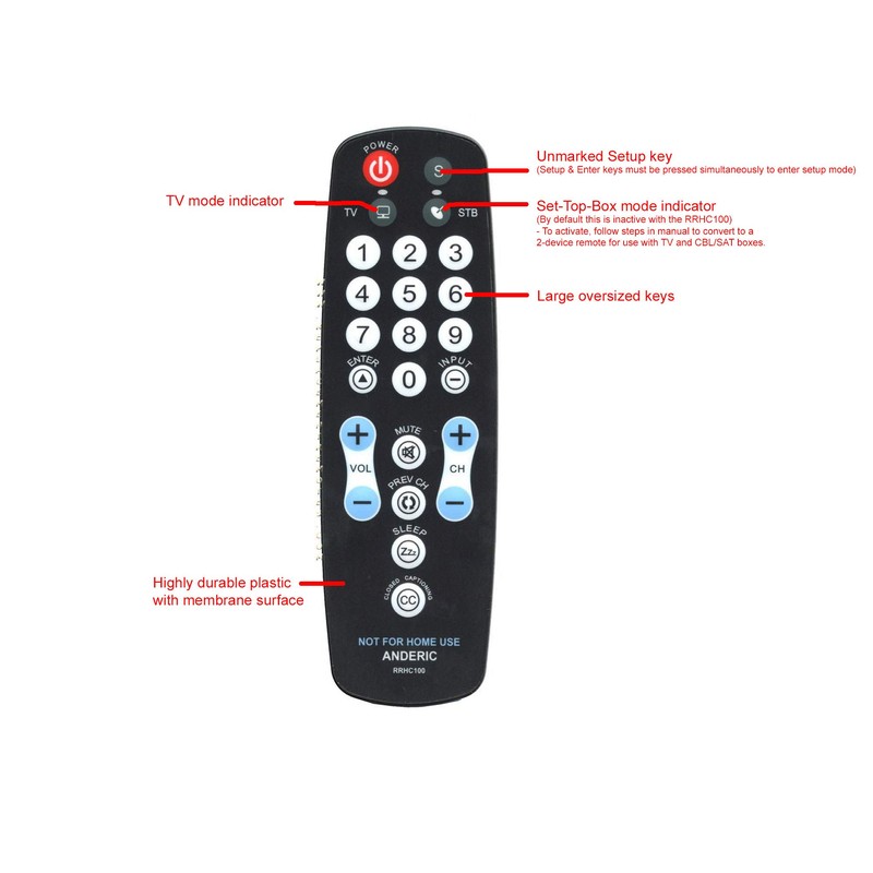 Anderic ezWipe Universal TV Remote Control - 1-Device - TV Only - for Hospitality/Hotels/Motels/Commercial TVs - Clean Wipeable Membrane Surface - RRHC100 (1-Pack)