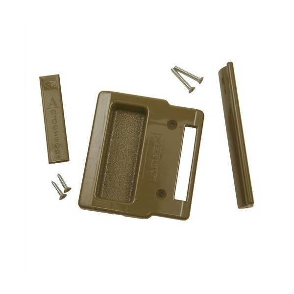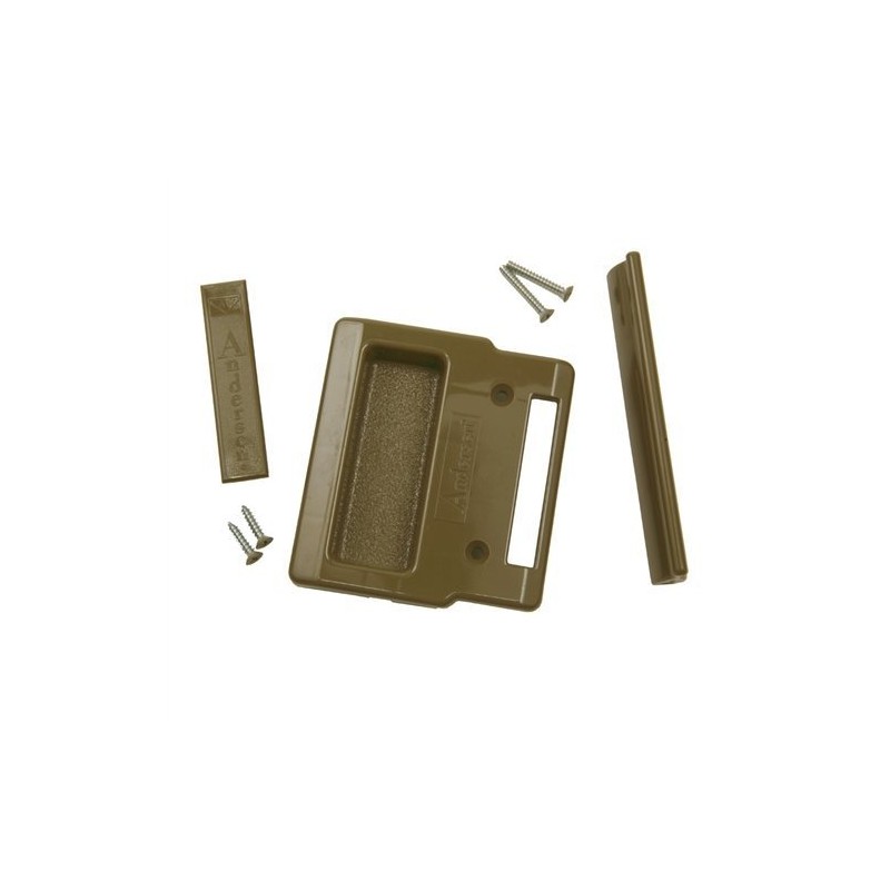 Andersen Screen Hardware Kit - Stone Color Works with Perma-Shield Gliding, Narroline Gliding and Frenchwood Gliding Patio Doors manufactured from 1982 to Present. Use with two-panel patio doors in sandtone or terratone color. Kit includes: Logo Plate, Interior Pull, Exterior Pull, (2) 6 x 5/8" screws and (2) 6 x 1" screws.