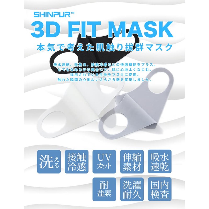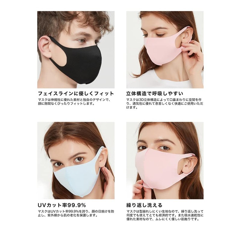- マスクは軽くて通気性・伸縮性が優れた高機能素材を使用しているので、安心していつも快適に過ごせます。マスクには肌触り拔群さらさら生地を採用しているので、肌触りも良く着け心地快適です。新品のマスクは開封直後に素材特有のにおいがする場合がございます。においが気になる場合は、ご使用前に中性洗剤で軽く手洗いいただきますとにおいが取れます。