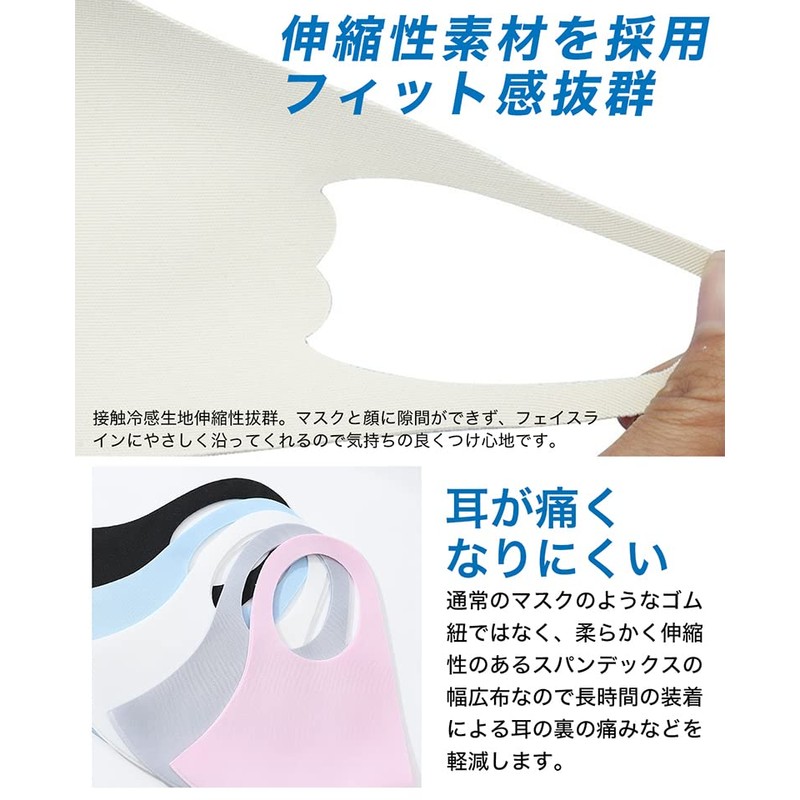 - 男女兼用の大人サイズと小さめの子供サイズ全方向に高いストレッチ性があるので通常の耳ゴムタイプよりも耳が痛くなりにくい