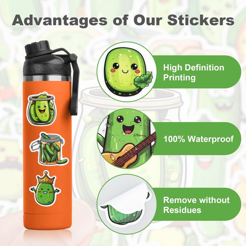 - Various pickle stickers: There are 50 pieces of different pickle sticker packs. The different stickers are all made of waterproof PVC vinyl stickers, high-resolution patterns and bright colours. All decals have a size of 2 to 3 inches. Cute stickers can bring a lot of fun to your life.
