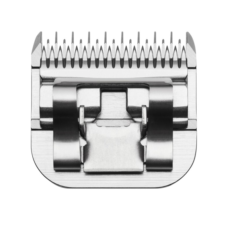 This UltraEdge dog clipper blade is made from high-carbon steel and processed through a unique carburizing heat treatment that actually adds carbon to the metal. More carbon on the metal means a harder cutting surface. Blades hold a razor sharp edge that will endure prolonged use and more sharpening treatments. Use for the finishing and blending of terriers. Blade is sharpened to exact quality stan dards and is h and-tested before it is shipped. Blade sets should be oiled once a day minimum. Ideally, it should be done before every grooming. After oiling, be sure to use a soft, dry cloth to wipe any oil off the external surfaces to reduce the possibility of getting it on the animal's coat. If the clipper blades leave streaks or slow down, it's a sure sign that the blades need oil. Oiling Blades - Place a few drops of blade oil on the front and side of the cutter blades. Wipe excess oil off blades with a soft, dry cloth. Spray lubricants contain insufficient oil for good lubrication, but are an excellent clipper blade coolant. Cleaning Blades - Immerse blades only while clipper is running in a shallow pan of clipper oil or blade cleaner. After cleaning, turn the clipper off and dry blades with a clean, dry cloth. If blades will still not cut, there may still be some hair trapped between the upper and lower blade. Remove the blade off the clipper and slide the upper blade to one side without loosening the tension spring or moving the upper blade completely out from under the tension spring. Wipe the surfaces of the blades clean with a dry cloth, then place a drop of clipper oil where the upper and lower blades meet and also in the guide slot of the tension spring. Comes in size- skip tooth and /-inch cut length. Measures -/-inch length by -/-inch width by -/-inch height.