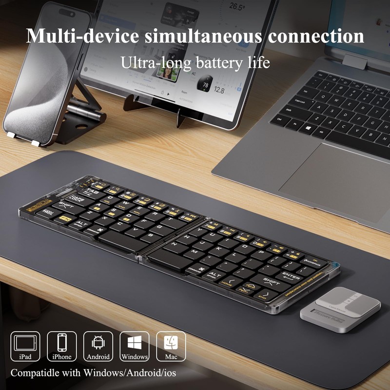 - 【Multi-Device Keyboard Mouse Combo】foldable wireless keyboard and mouse set offers seamless connectivity for up to 3 devices (2.4G+BT+BT), you can use your laptop, tablet, and phone simultaneously. Easy switch with a simple press of a button. This versatile set is compatible with a variety of operating systems including Windows, macOS, Chrome OS, iPadOS, Android, and more