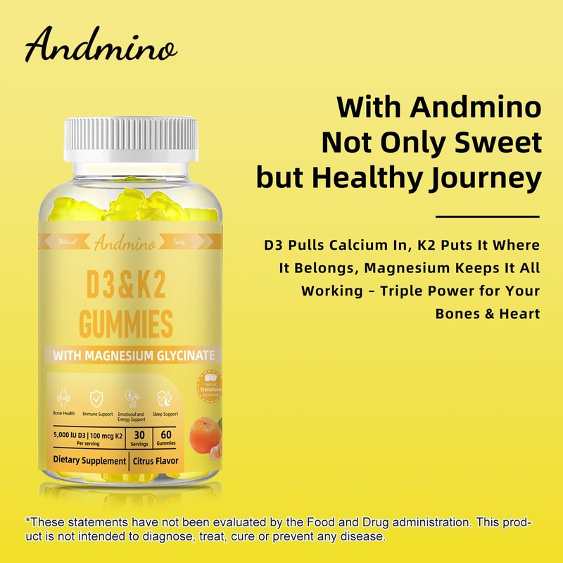 Andmino Vitamin D3 K2 Magnesium Gummies | 5000IU D3 + 100mcg K2 MK-7 + 150mg Magnesium Glycinate | for Bone, Immune & Sleep Support | Non-GMO, Vegan, Gluten Free | Citrus Flavor, 60 Count