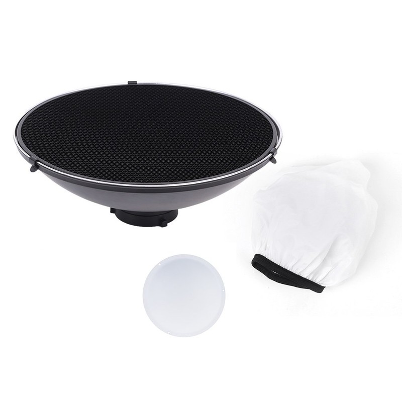 - ★ This beauty dish contains a grid to enhance the light effect and a soft cloth to soften the strong light, and the white cloth will soften the light even more. Creates a unique light pattern on the subject offering a round catch of light into the subject's eye.