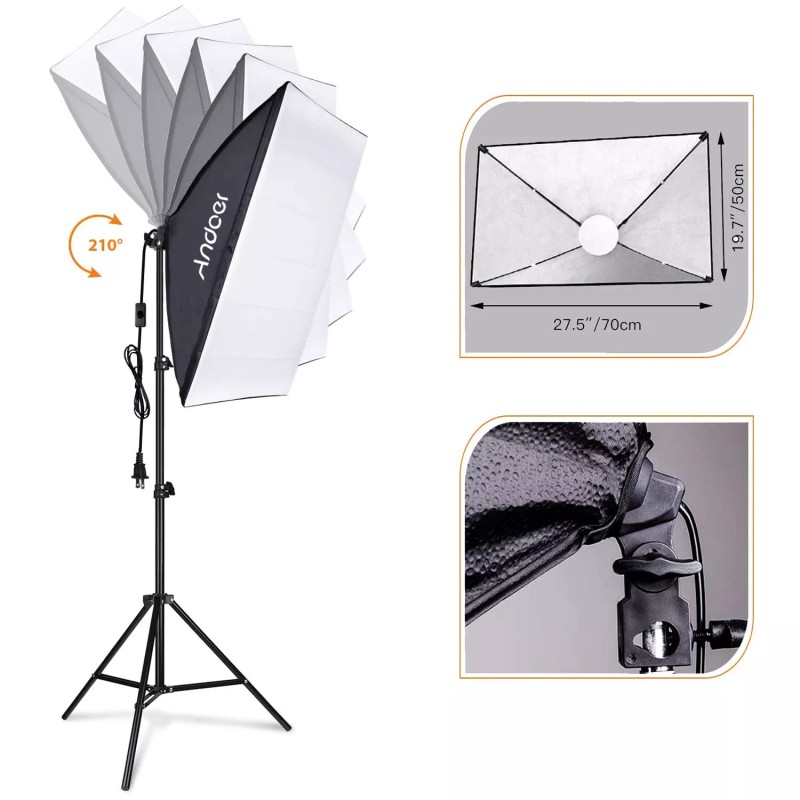 Large Flexible Softbox:50 * 70cm/ 20 * 28in large softbox with white diffuser cloth provides you with perfect even lighting; with E27 socket for direct installation of LED light; and the softbox can 210° rotate to let you have optimal light angles, making your photos and videos more professional.