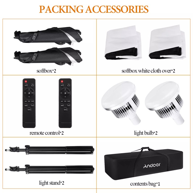 - package Included: 2 * LED lights, 2 * softboxes, 2 * light stands, 2 * remote controls and 1 * carry