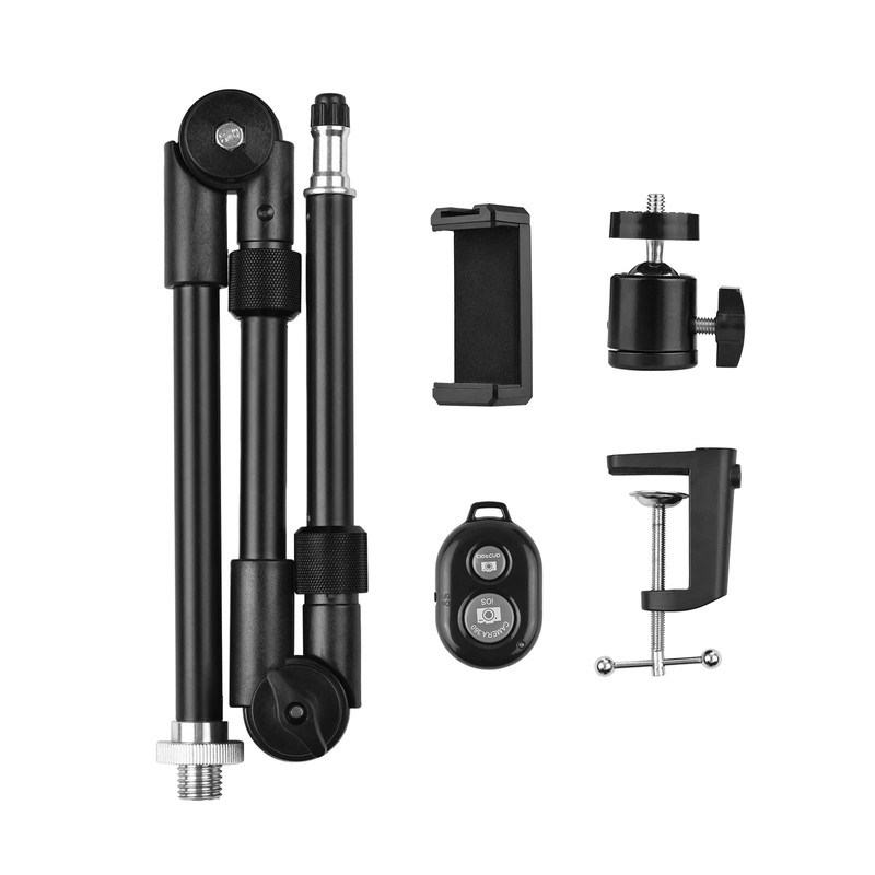- 【Strong Compatibility】3kg load capacity, standard 1/4 inch screw, and comes with a phone holder and a remote shutter, the metal bracket not only can work as a phone stand, but also suitbable for installing webcam, microphone, LED ring light, projector, etc.