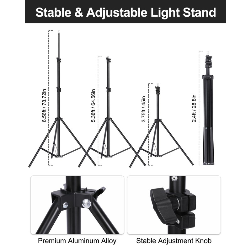 - 【Durable & Adjustable Metal Light Stand】The light stand is made of premium aluminum alloy, and can extend from 76-200cm; stable 3-leg design and the solid locking system make it safe and reliable to use.
