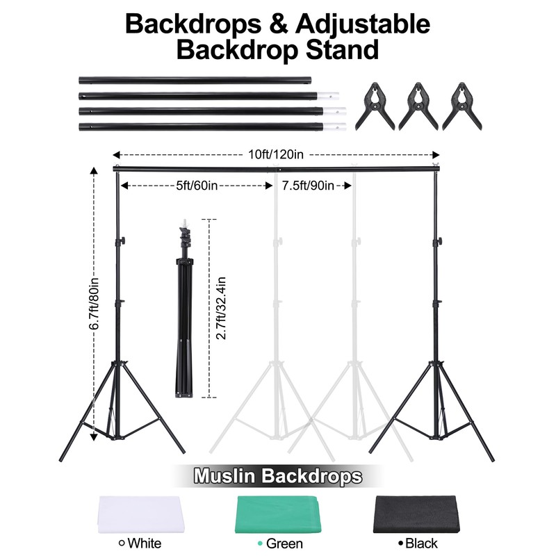 - 【Backdrop for More Professional Photography】With 4pcs 1.6 * 3 meters backdrops(White/Black/Green), 3pcs backdrop clamps and 1 set of backdrop stand, the backdrops can help absorb the light and eliminate reflection, suitable for studio portraits photography, fashion photo and children's photo taking or video recording, etc.