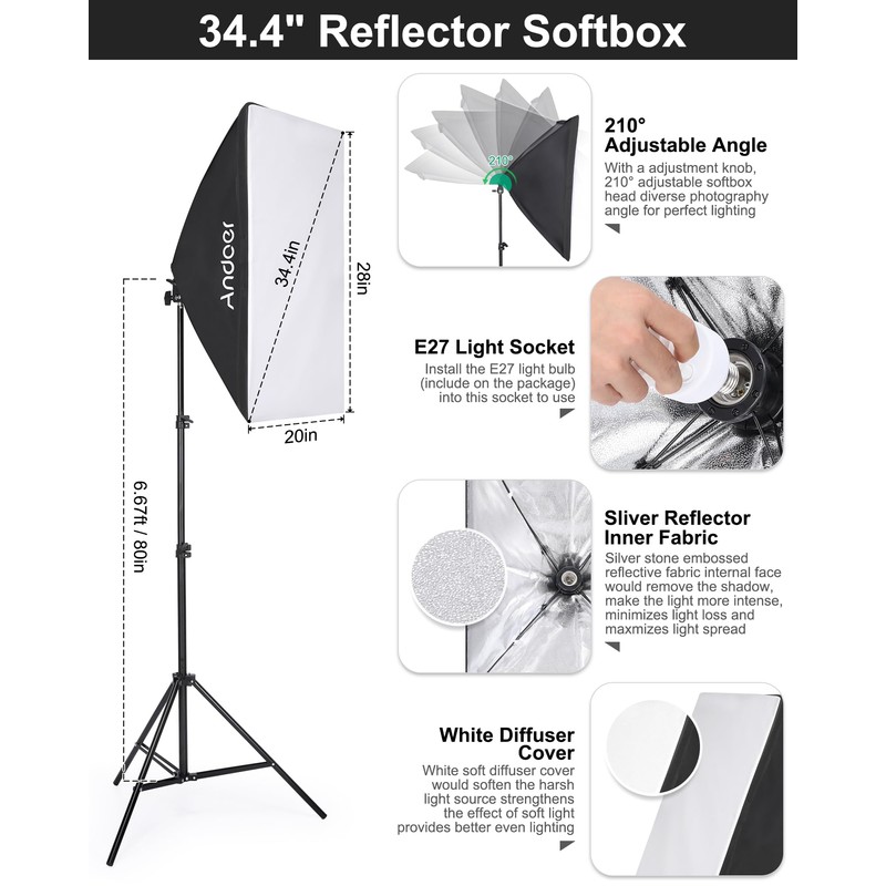 - 【Large Flexible Softbox】50 * 70cm/ 20 * 28in large softbox with white diffuser cloth provides you with perfect even lighting; with E27 socket for direct installation of LED light bulbs; and the softbox can 210° rotate to let you have optimal light angles, making your photos and videos more professional.