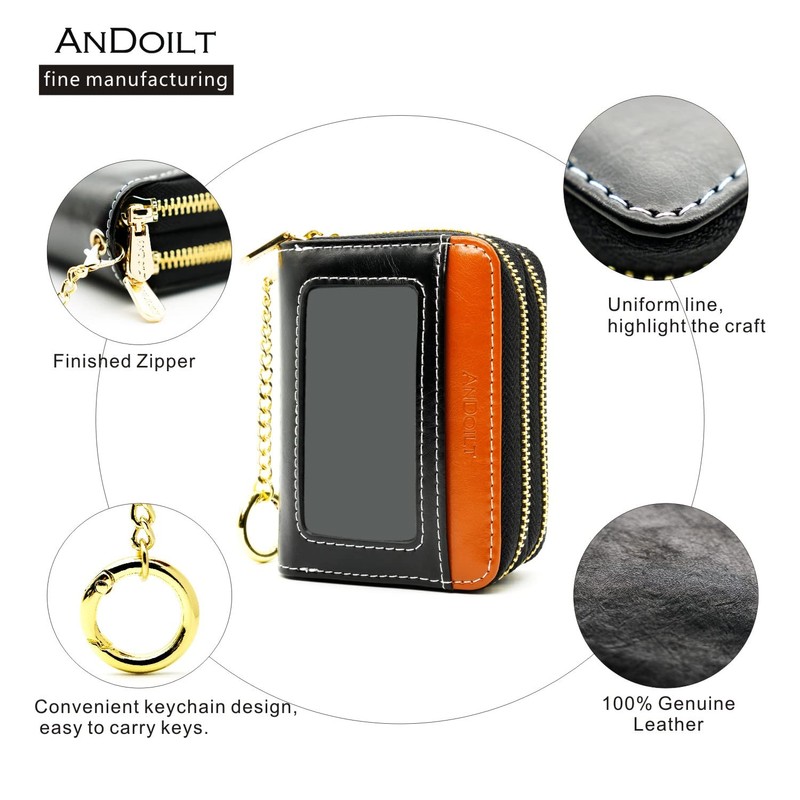 ANDOILT Small Genuine Leather Wallet for Women Men RFID Blocking Identity Safe Double Zipper Accordion Credit Card Holder Keychain Wallets Black