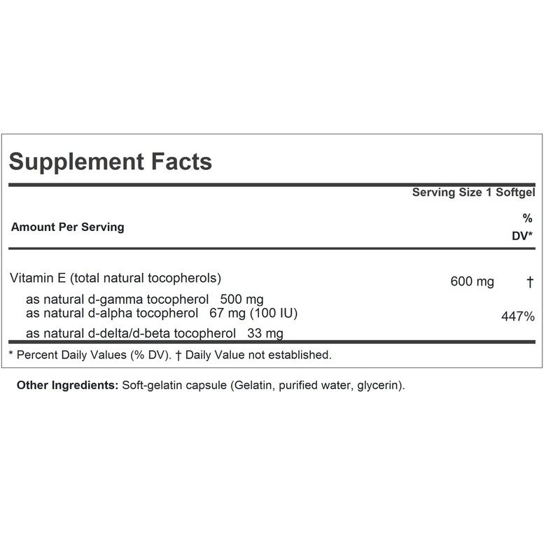- SUPERIOR 100% PURE BIO-ACTIVE INGREDIENTS – Delivers 600 mg of all four natural Tocopherols with 500 mg of all-important Gamma Tocopherol. Contains NO Milk / Dairy-Free, Gluten-Free; NO soy, yeast, corn, wheat, sodium, salt, sugar, cholesterol, color, preservative, common allergens or manufacturing additives.