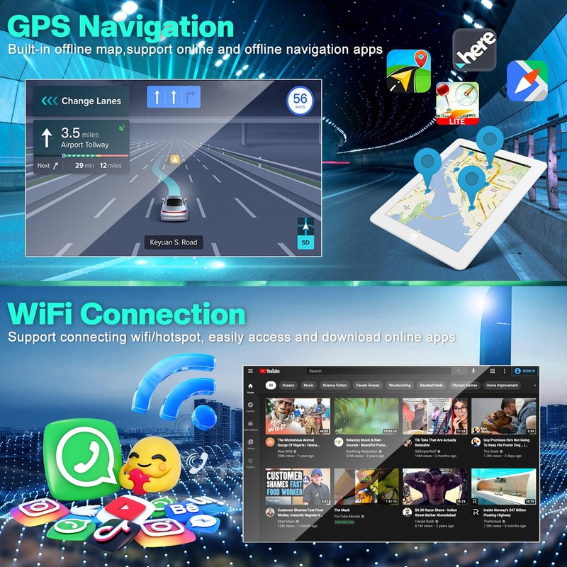 - GPS Navigation & WiFi Connection: This 9 inch car radio for Subaru Forester supports online and offline navigation. You can use the navigation function whether there is a network or not. With Here We Go app, you can navigate to anywhere even without the network, only need to download needed offline map data, never worry about getting lost