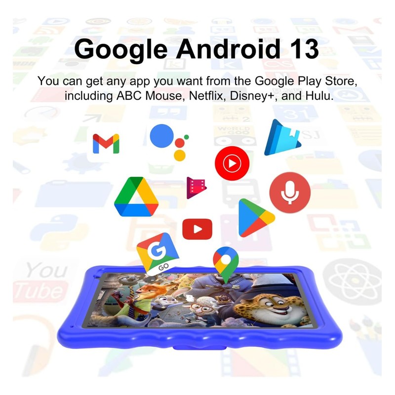 - Android 13 kids Tablet Excellent Performance: 10 inch kids Tablet is featured with high performance CPU Quad-core, 2+2(Expand)GB RAM and the newest Android 13 Operating System. You can download different apps from the Google play store for your kids, such as ABC Mouse, HULU, YouTube Kids, Netflix, Zoom,etc.
