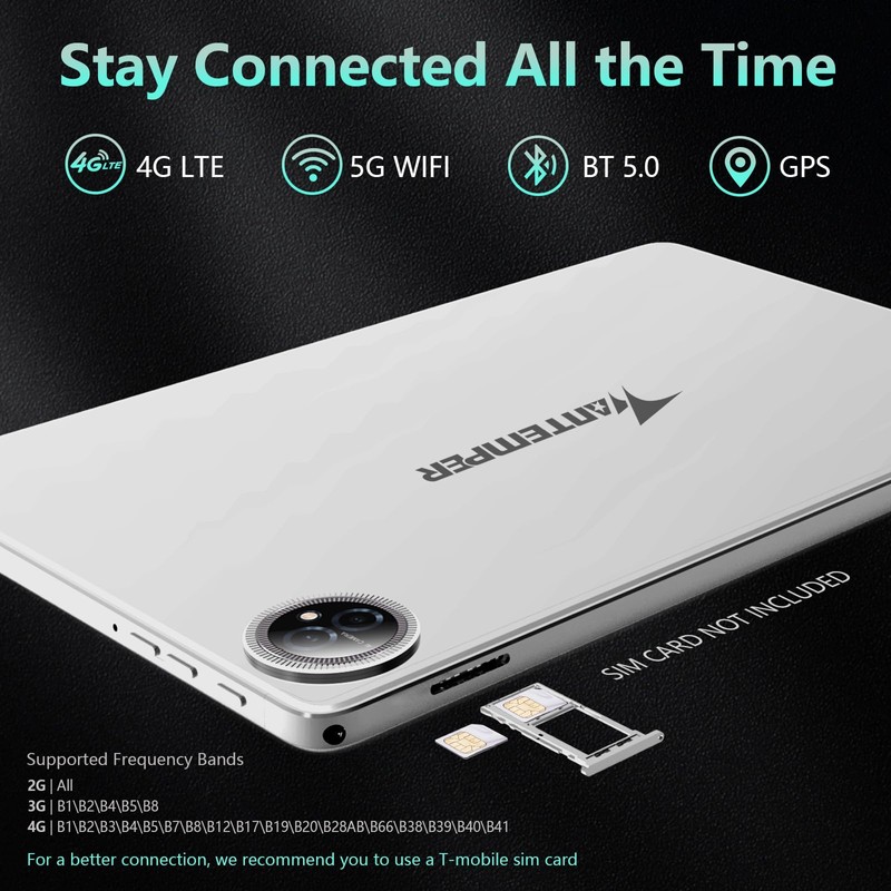 - 【4G Cellular Data& 5G WiFi】This tablet has dual slots for nano sim card, and can provide fast and steady 4G/3G/2G connectivity and internet access. Plus, this WiFi tablet supports 5G+2.4G WiFi, Bluetooth 5.0 and GPS location. (SIM card not included) With this tablet, you can get connected to your family and friends online wherever you are.【👍To get better connection, we suggest you to use T-MOBILE SIM card】