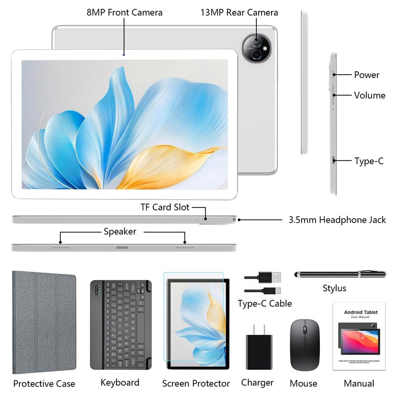 - 【Tablet with Accessories Kit & 8000mAh Large Battery】This 2-in-1 tablet comes with a wireless keyboard, wireless mouse, foldable case, stylus, charger, and USB-C cable. A set of portable accessories will suffice in a pinch. 8000mAh battery capacity ensures you go unplugged for hours to keep the fun going.