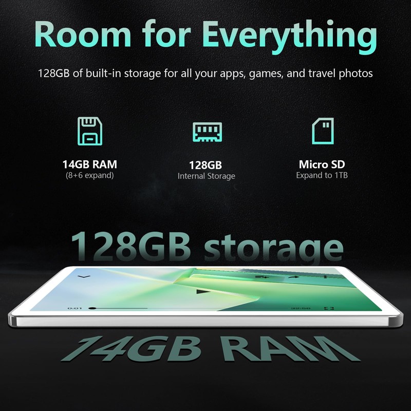 - 【128GB +14(8+6)GB | Large space to meet your need】128GB of built-in storage allows you to save all your apps, games, and travel photos to your Android tablet. (You can expand your tablet to 1TB via TF card (sold separately)). This tablet is equipped with 14GB RAM(8+6 expand), ensuring a fast and smooth entertainment experience.