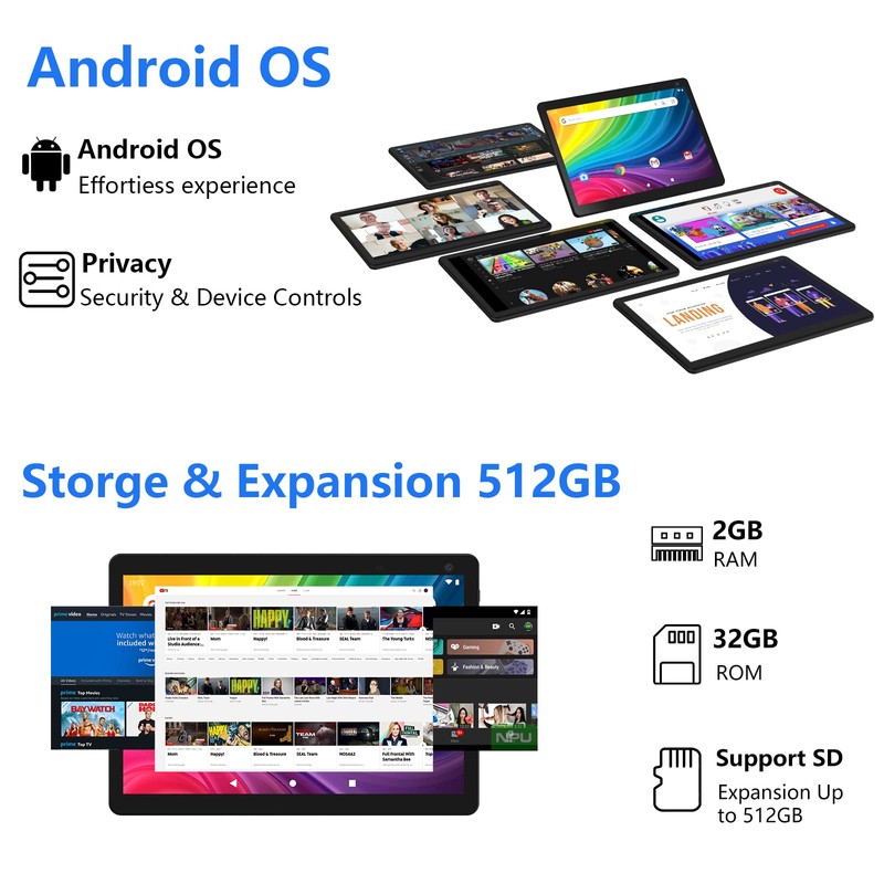 - 【2GB+32GB and 512GB Expand】 32GB ROM Tablet support Most 512GB MicroSD card (Card not included) storage your movies, musics, photos, anything you want. Bluetooth and Type-C Cable so that you can Transfer your data from computer etc.