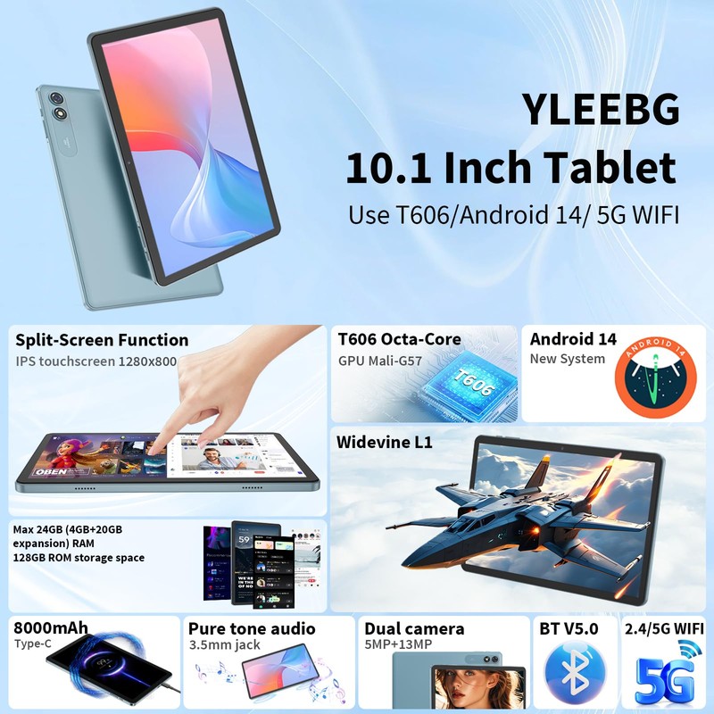 - 【Android 14 operating system】The YLEEBG tablet uses the latest Android 14 operating system, which offers higher security and privacy. The Android 14 tablet has updated personalized features, improving the overall device user experience