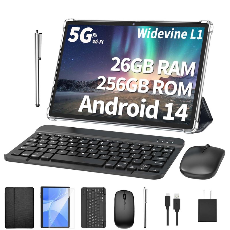 Android Tablet with Keyboard, 26GB RAM, 256GB ROM(1TB Expand), 10.1 inch Android 14 Tablet, 8000mAh Battery, BT 5.0, GMS Certified, 2.4G&5G WiFi, 2 in 1 Tablets with Mouse, Case, Stylus(Black)