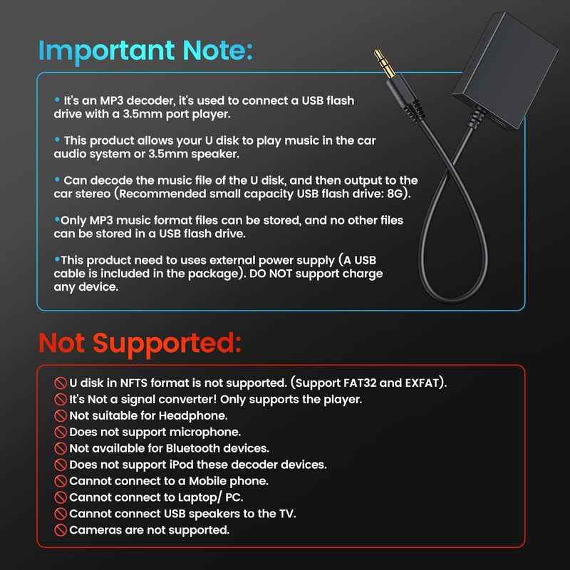 - 【Note】: 1) It's not a signal converter! 2) Only supports the player. 3) Not suitable for USB headphone. 4) Cannot connect to Laptop/ PC. 5) Cannot connect USB speakers to the TV. 6) Does not support iPod these decoder devices (This product uses external power supply. A USB cable is included).