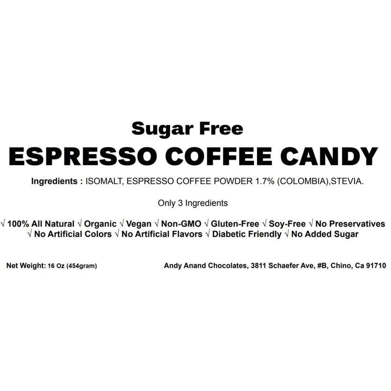 Andy Anand 130 Pc Sugar free Espresso Coffee Candy, made with Real Coffee, Only 3 ingredients, Sweetened with Natural Stevia, Made in Europe, Vegan, Gluten Free (1 lbs)
